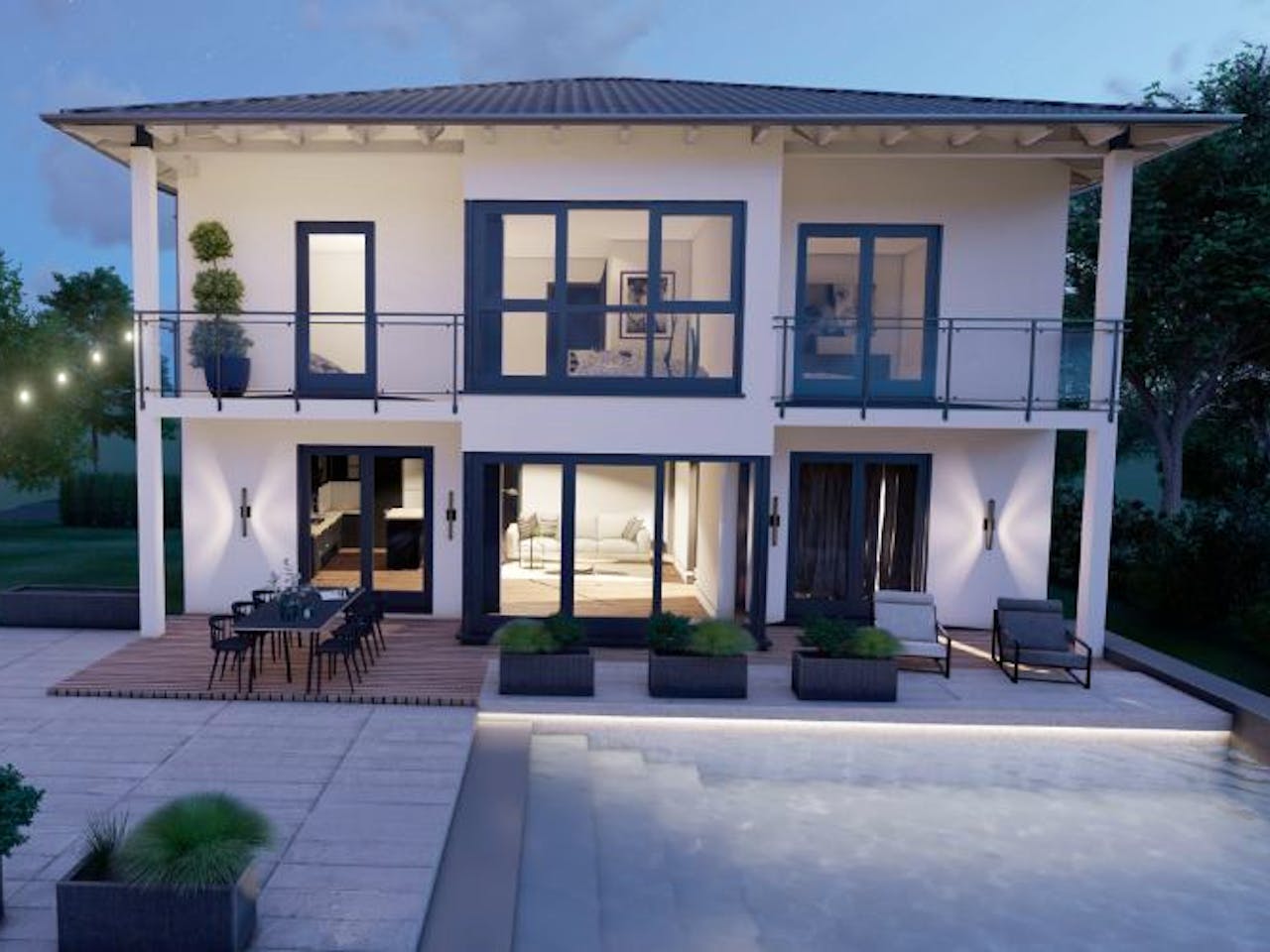 Durch die hohen, großen Fensterelemente und die klare Dachform strahlt die Stadtvilla Remagen Eleganz und Ruhe aus!