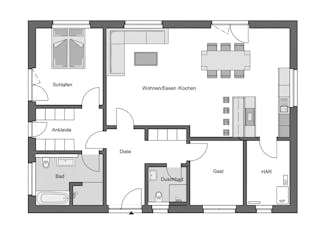 Passen Sie den Grundriss an Ihre persönlichen Bedürfnisse an und besprechen Sie Ihren individuellen Plan mit einem Bauberater des Anbieters.