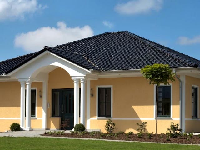 Ein formschönes anthrazitfarbenes Walmdach in Verbindung mit einem hellgelben Edelputz verleihen dem Bungalow Madeira ein geschmackvolles Äußeres.