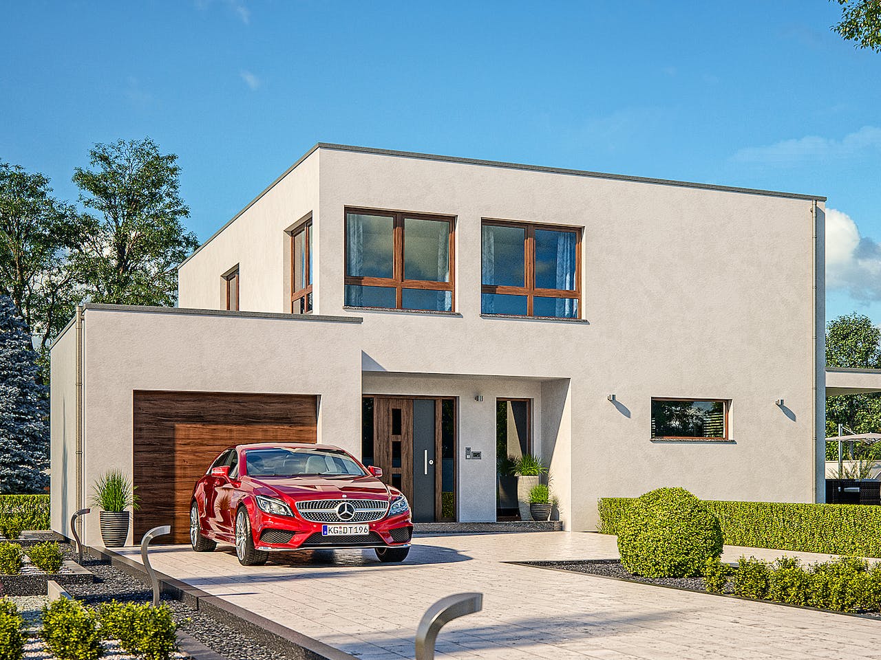 Puristisch und modern präsentiert sich der Entwurf des Hauses Toronto. Markante Details, wie ein überdachter Eingangsbereich oder die im Hauskörper integrierte und von filigranen Rahmen umgebene Loggia, runden das Erscheinungsbild in geschmackvoller Art und Weise ab. Der Grundriss ist konsequent geradlinig und entspricht einem außergewöhnlichen Wohnkonzept. Direkt vom Windfang aus gelangt man in den üppig dimensionierten und großzügig verglasten Mittelpunkt des Hauses. Dieser Bereich, der für gemeinsames Kochen und Essen reserviert ist, dient gleichzeitig als Dreh- und Angelpunkt des gesamten Familienlebens: Von hier aus kommt man in alle übrigen Räume des Erdgeschosses. Auch die geradläufige Treppe findet hier ihren Platz und führt auf direktem Wege in die obere Etage.