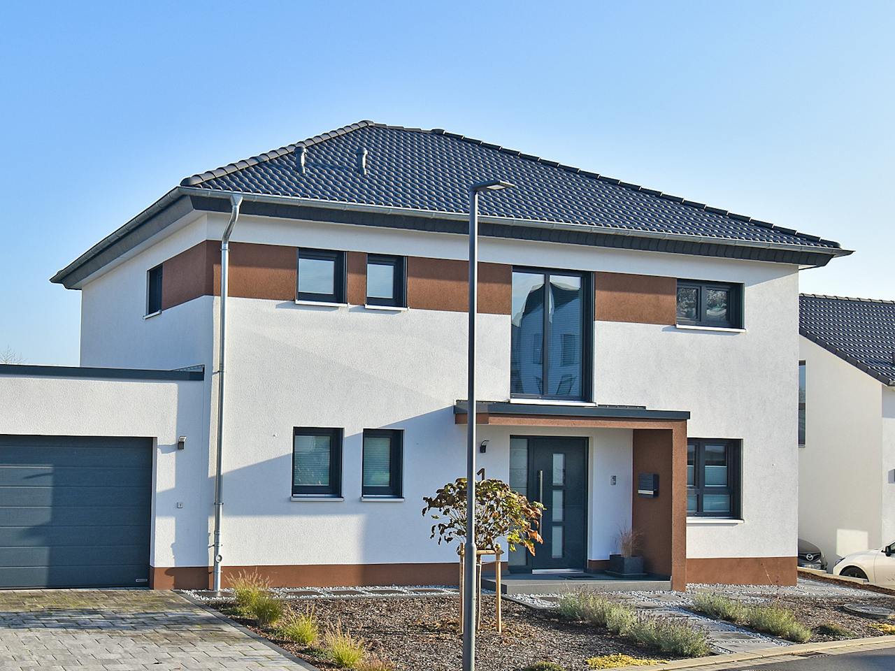 Die klassisch-klaren Linien der weiß gestrichenen Fassade harmonieren perfekt mit dem anthrazitfarbenen Walmdach. Braune Farbakzente verleihen der Fassadengestaltung eine Portion Raffinesse. Große, bodentiefe Glaselemente – vor allem gartenseitig – wirken elegant und sorgen für jede Menge wohngesundes Tageslicht in den Zimmern.
