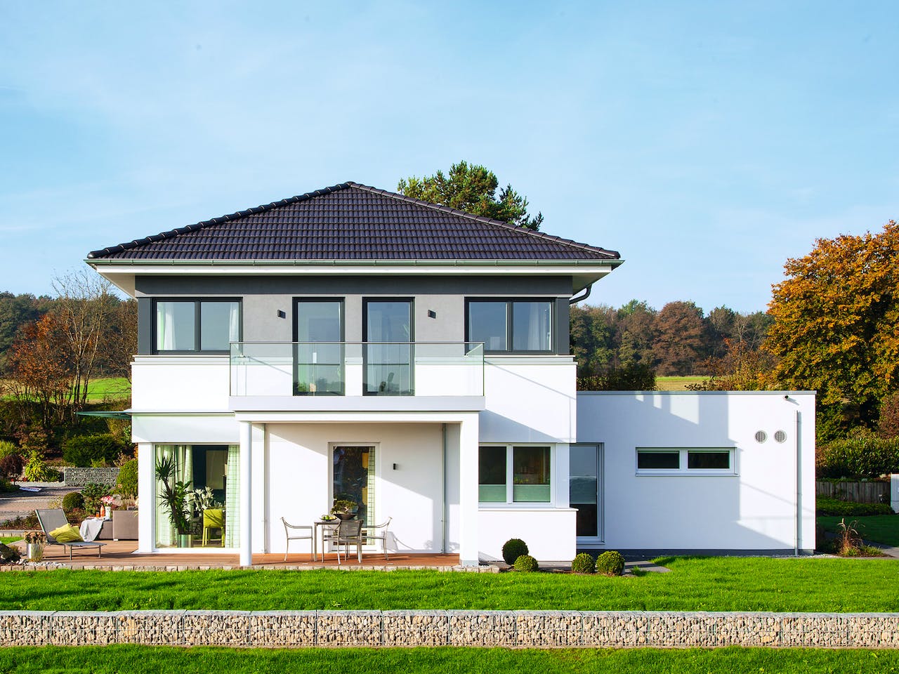Die schicke Stadtvilla in Wenden-Hünsborn ist optisch ein echter Hingucker. Das CityLife 700 bietet 178 Quadratmeter Wohnfläche unter einem speziell ausgeführten Walmdach mit ästhetisch umgesetzter Solaranlage. Das obere Geschoss wurde mittels eines architektonischen Kniffes, wie ein Staffelgeschoss anmutend, abgesetzt. Außen zeigt sich das kubische Haus in hellem Weiß und modernem Grau, innen kontrastieren rustikale Eichenböden mit der modernen Farben- und Linienführung der Innenarchitektur. Eine kontrastreiche Stadtvilla im Sinne der Wohngesundheit, umgeben von Terrasse und komplettiert von einem großzügigen Balkon – das ist das CityLife 700.