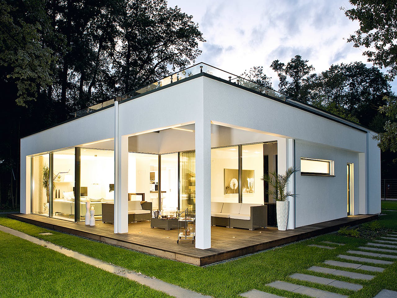 Dieser schicke Bungalow ist ein echtes Traumhaus für alle, die Wert auf Komfort legen und heute schon an Morgen denken. Denn hierbei handelt es sich um einen frei geplanten Hausentwurf von dem Wohnkonzept WeberHaus ebenLeben, das Funktionalität und Design perfekt auf einer Wohnebene vereint. Klare Linien, fließende Übergänge sowie großzügige Bewegungsflächen sorgen für Barrierefreiheit und verleihen jedem Raum ein Gefühl von Freiheit. Optisch beeindruckt der moderne Winkel-Bungalow mit rahmenlosen sowie bodentiefen Panoramafenstern, schickem Flachdach und angesagter Bauhaus-Architektur.